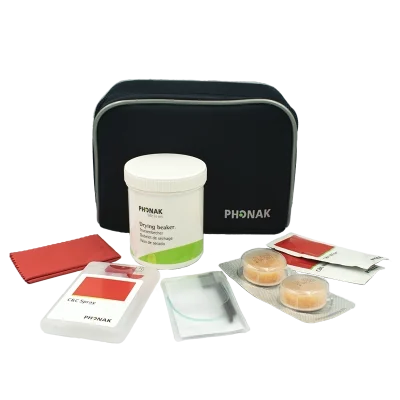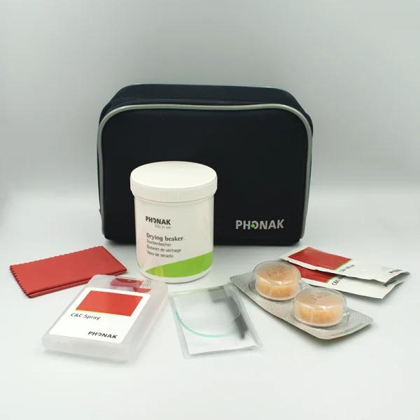 Denne hygiene kassen inneholder: Phonak hygiene veske med 1 stk. DryCup med siv, 2 stk. Tørretabletter, 2 stk. Rensebørster, 10 stk. desinfiserende servietter, 1 stk. 18 ml. desinfiserende spray, 1 stk. mikrofiber serviett.