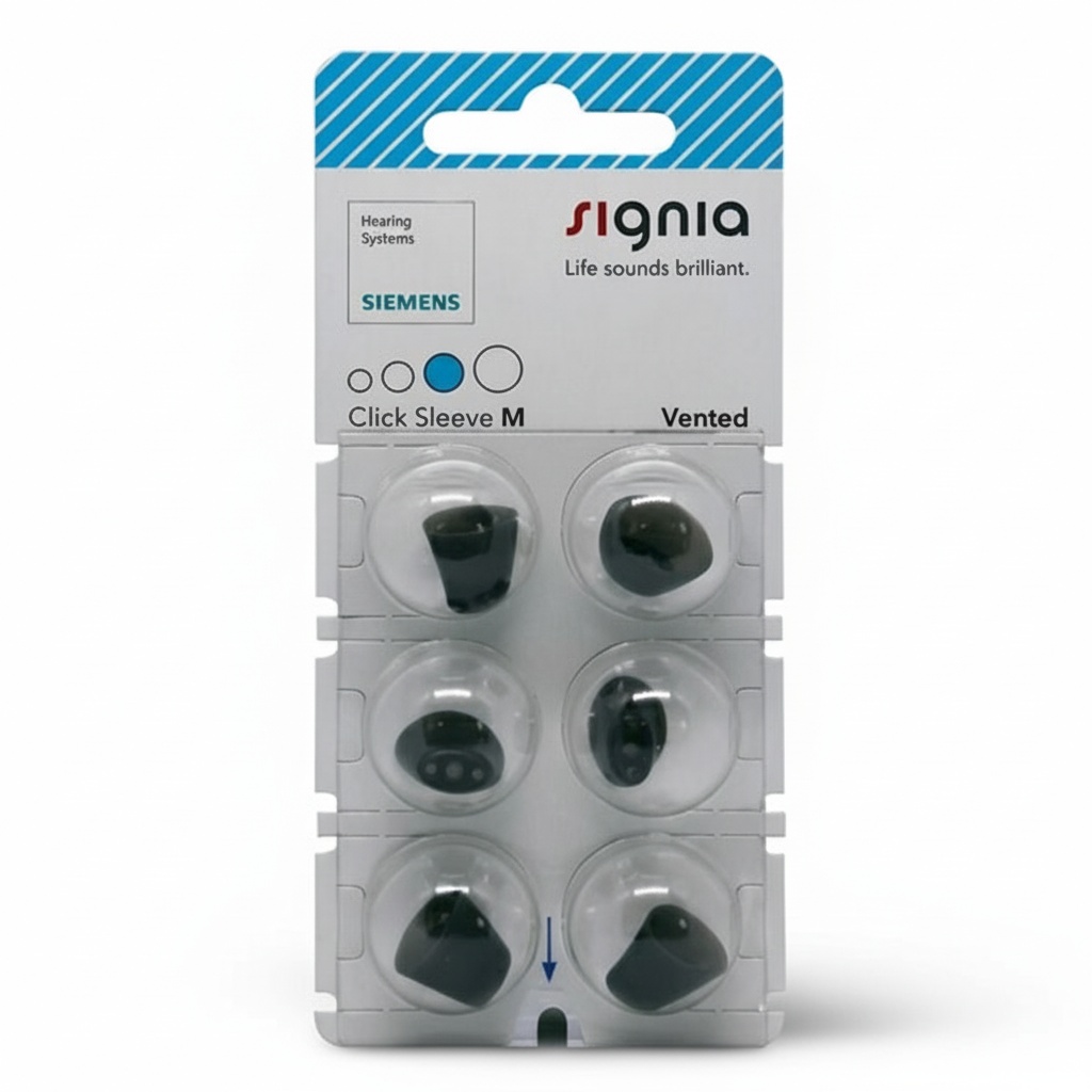 Signia Click Sleeves er domes til høreapparater. Disse kan brukes til flere av høreapparatene fra Signia, som for eksempel Signia Silk og normale recievere til høreapparatet. Signias små Silk høreapparater er nesten usynlig i øret og domen kan settes på høreapparatet for å sikre den perfekte passformen i øregangen. Anti-skli effekten fører til at høreapparatet ligger stabilt i øret hele tiden. Du kan velge mellom flere versjoner av Signia Click Sleeves og det finnes både en åpen og ventilerende versjon.