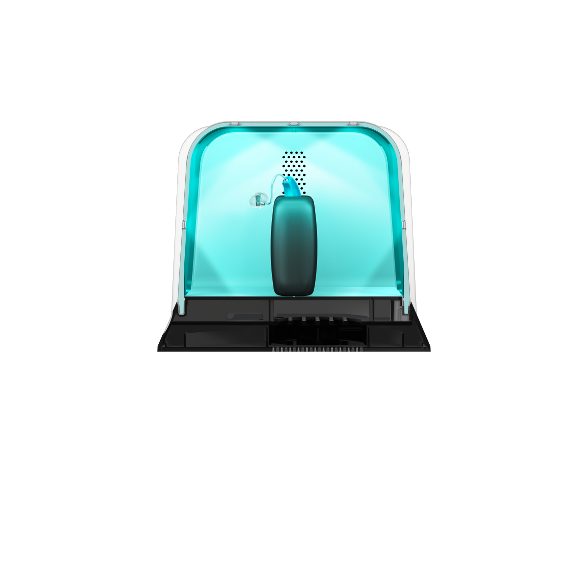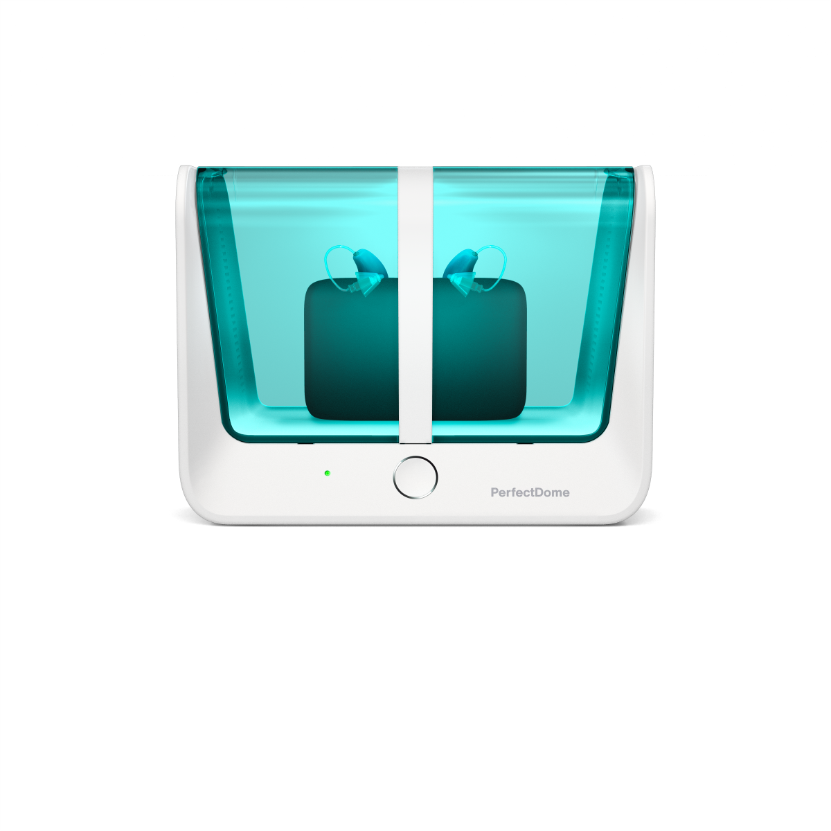 Gjennom dagen blir høreapparatene dine og laderne deres utsatt for temperatursvingninger og fuktighet, noe som ikke er optimalt for enhetene. Med den kompakte tørkeboksen trenger du ikke lenger bekymre deg for høreapparatene eller laderne i regnvær, under fysiske aktiviteter eller på ferier i fuktige områder. Boksen sikrer at fuktighet ikke skader elektronikken i høreapparatene og laderne. PerfectDome er en tørkeboks som skånsomt og nøye tørker høreapparatene dine og deres ladere ved hjelp av et patentert pulserende varmlufts-avfuktingssystem. Tørkeboksen sikrer optimal tørking av høreapparatene og laderne, og bevarer den sarte elektronikken. UV-C LED-lys desinfiserer høreapparatene og laderne samtidig, og gjør dem fri for skadelige partikler og klare til bruk. Levetiden til høreapparatene og laderne forlenges, og du er alltid sikker på å ha tørre og friske enheter hver dag.