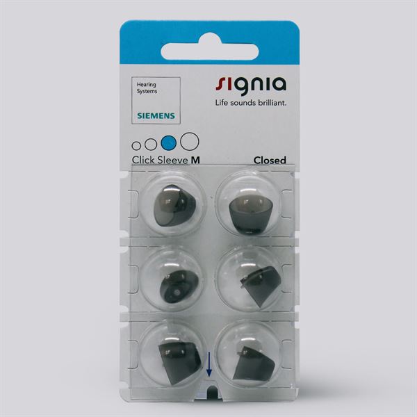 Signia Click Sleeves er domes til høreapparater. Disse kan brukes til flere av høreapparatene fra Signia, som for eksempel Signia Silk og normale recievere til høreapparatet. Signias små Silk høreapparater er nesten usynlig i øret og domen kan settes på høreapparatet for å sikre den perfekte passformen i øregangen. Anti-skli effekten fører til at høreapparatet ligger stabilt i øret hele tiden. Du kan velge mellom flere versjoner av Signia Click Sleeves og det finnes både en åpen og ventilerende versjon.